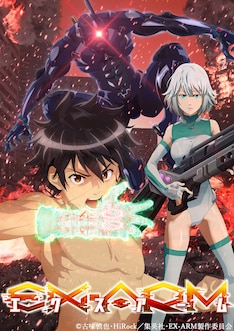 原作マンガは交通事故後に脳だけを取り出され、超常的な能力を持つ兵器となってしまった高校生・夏目アキラを軸に描かれる犯罪バトルもの。アキラは失われた記憶と体を取り戻すため、警察内部組織・EX-ARM対策課に協力することになる。アニメ「EX-ARMエクスアーム」のビジュアルにはアキラと戦闘用ボディのオーガ、アンドロイドのアルマが描かれた。