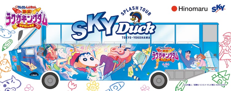 「映画クレヨンしんちゃん 激突!ラクガキングダムとほぼ四人の勇者」と水陸両用バス・スカイダックがタイアップしたラッピングバスが、明日3月20日から5月31日までの期間に東京で運行される。