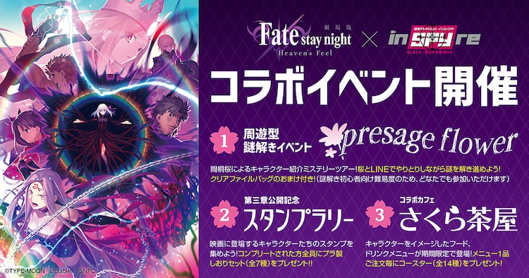 劇場版「Fate/stay night [Heaven’s Feel]」とスパイ体験ができる東京のアトラクション施設・inSPYre(インスパイヤ)がコラボレート。謎解きイベント「presage flower」が4月10日から5月10日まで開催される。