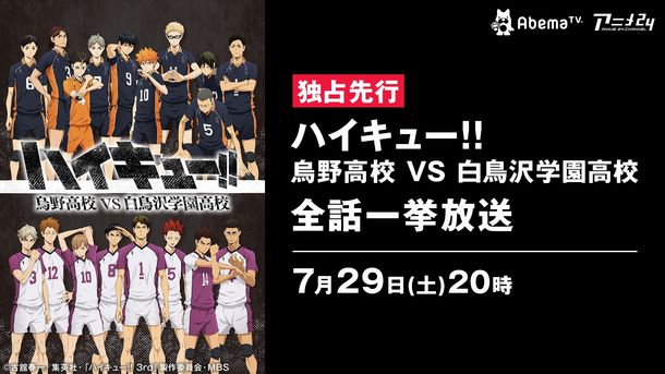 古舘春一原作によるアニメ「ハイキュー!! 烏野高校 VS 白鳥沢学園高校」の全話一挙放送が、7月29日にAbemaTVのアニメ24チャンネルにて行われる。