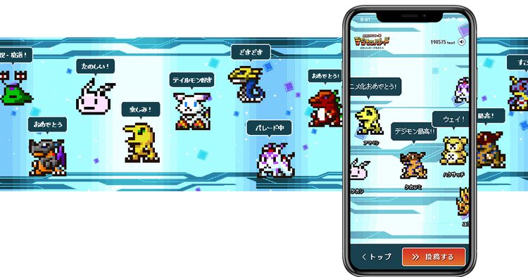 スマートフォン専用の特設サイトではドット絵風のデジモンたちが動く「デジモンパレード」の様子を見られるほか、投稿したいメッセージを入力して好きなデジモンを選ぶと、パレードに登場させることができる。詳細はサイトにて確認しよう。
