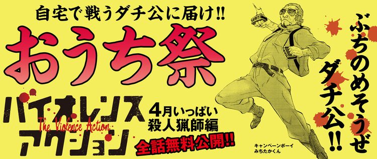 やわスピで“おうち祭”!「バイオレンスアクション」殺人猟師編を無料公開 2020年4月8日2020年4月8日 editor 「おうち祭」のバナー。沢田新原作による浅井蓮次「バイオレンスアクション」の長編「殺人猟師編」が、小学館のWebサイト・やわらかスピリッツにて無料公開された。 これは同サイトにて実施される「おうち祭」と題した企画の第1弾となるもの。「バイオレンスアクション」の「殺人猟師編」は4月いっぱい無料で読むことができる。「おうち祭」では今後もやわらかスピリッツの作品が順次無料公開されていく予定だ。 関連記事青山剛昌、房総半島の特殊な隧道の謎に挑む「道との遭遇」でバラエティ番組ロケ初出演「神呪のネクタール」呪乳100選ポスターがRED付録に ロボットバトル新連載も「天使なんかじゃない」リップやアイシャドウなどメイクアイテム登場、羽チャーム付き傷心青年×不良僧侶、この出会いが人生を変える「あかつきに漣」1巻イケメン女子高生と地味な眼鏡女子の秘密の交友録「かわいい同盟」1巻発売記憶を消された元魔法少女たちの全国食べ歩き旅行「魔法少女・ぐるめぐり」1巻発売 Tweet 関連コミック バイオレンスアクション