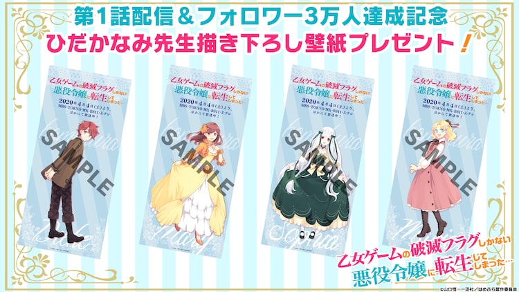 TVアニメ「乙女ゲームの破滅フラグしかない悪役令嬢に転生してしまった…」より、キャラクター原案・ひだかなみの描き下ろしイラストを使用した、スマートフォン用壁紙の配布がスタートした。