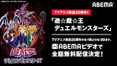 「遊☆戯☆王デュエルモンスターズ」の放送20周年を記念した今回の施策では、アニメ全224話を無料配信。4月18日19時20分からは、「今日はずっと俺のターン!!!」と題した特別企画としてABEMA内のみんなのアニメチャンネルにて「バトル・シティ編-後編-」の一挙配信も行なわれる。そのほかABEMAアニメの公式Twitterでは、10日間にわたり「遊☆戯☆王デュエルモンスターズ」のオープニング・エンディング映像を紹介する企画も実施予定だ。