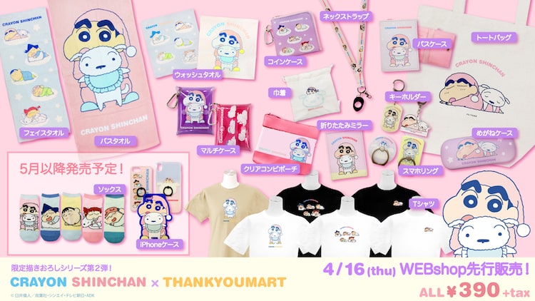 臼井儀人原作によるTVアニメ「クレヨンしんちゃん」とサンキューマートの新作コラボグッズが、4月21日より全国のサンキューマートで販売される。