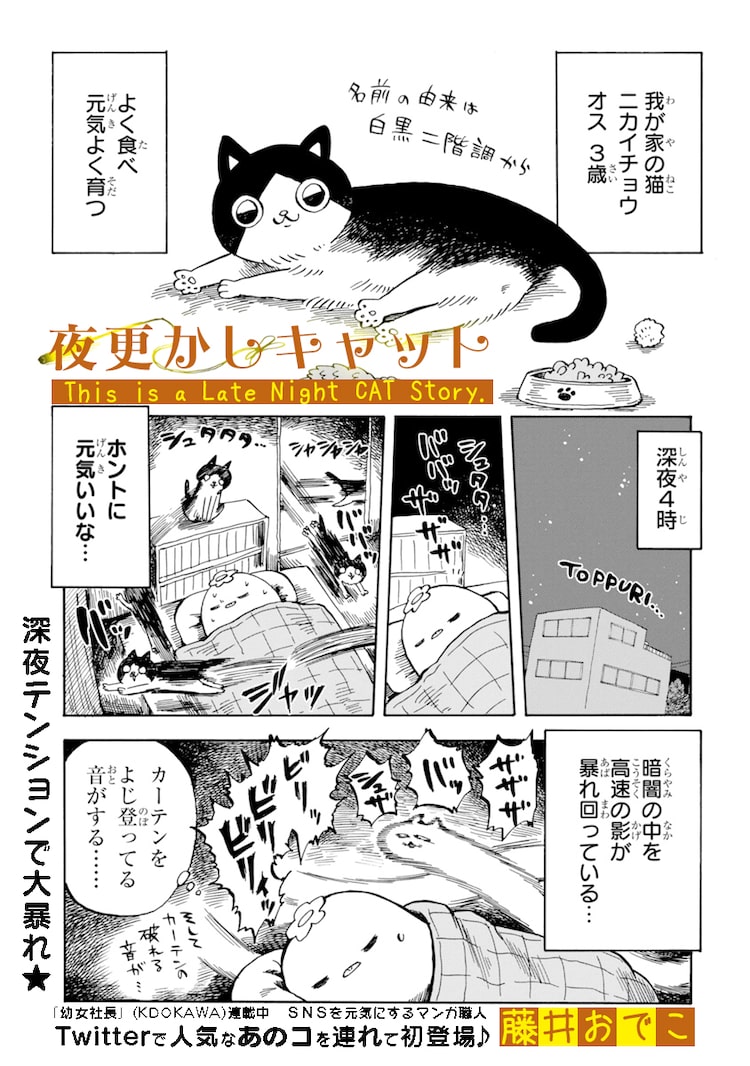 「夜更かしキャット」は猫にまつわるショートエッセイマンガをさまざまな作家が執筆する「猫と、」の一環として配信されたもの。深夜になんとか遊んでもらおうと飼い主の気を引こうとする猫のニカイチョウと、ワガママが癖にならないように寝たフリを決め込む藤井の攻防がコミカルに描かれている。