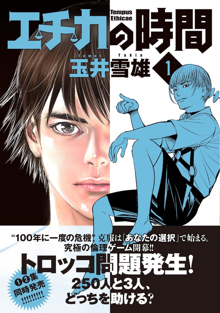 倫理をテーマに描かれる「エチカの時間」は、「人類の永遠のテーマはいかに働かないか?」だと考えるフリーター・日野の前に、突如次世代AIの七太郎とエチカアカデミーと名乗る謎の集団が現れるところから動き出す。彼らの目的はAIの倫理を育てること。日野は渋谷スクランブル交差点付近での鉄球落下事故で、250人と3人、どちらか一方を助けられるとしたらどちらを助けるか、という選択を迫られる。その選択は現実を決定すると言い……。倫理学の思考実験「トロッコ問題」に焦点を当て、「倫理とは何か?」を追求していく。なお1・2巻には玉井と評論家の荻上チキがトロッコ問題について語り合う対談がそれぞれ前後編にて収録されている。