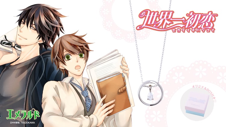 中村春菊「世界一初恋」モデルのネックレスは、小野寺律と高野政宗、2人の思いとつながりをイメージ。トップのリングの間には揺れるストーンが配置されており、側面には「世界一初恋」の文字が英字で刻印されている。同じく中村の「純情ロマンチカ」をモデルにしたネックレスは、高橋美咲と宇佐見秋彦を表現したもの。ウェーブタイプのリングにライトブルーとホワイトのキュービックジルコニアがデザインされており、側面に「純情ロマンチカ」と英字で刻印された。