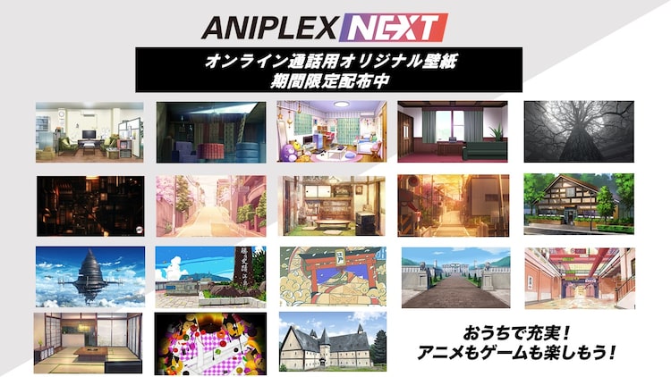 これは、アニプレックスの最新情報を発信する「ANIPLEX NEXT(アニプレッククスト)」のWeb企画「おうちで充実!アニメもゲームも楽しもう!」の一環として実施されるもの。配布されている画像はアニメ本編の背景を切り取ったもので、「あの日見た花の名前を僕達はまだ知らない。」の秘密基地、「かぐや様は告らせたい~天才たちの恋愛頭脳戦~」から生徒会室、「鬼滅の刃」の無限城、「劇場版『Fate/stay night [Heaven’s Feel]』」から衛宮家の居間など、オンライン通話の背景に設定すると、作品世界に入り込んだ気分を味わえるものが揃えられた。