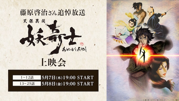 4月12日に癌のため逝去した藤原啓治の追悼企画として、主演を務めたアニメ「天保異聞 妖奇士」の無料配信が、ニコニコ生放送にて5月7日、8日の2日間にわたって実施される。