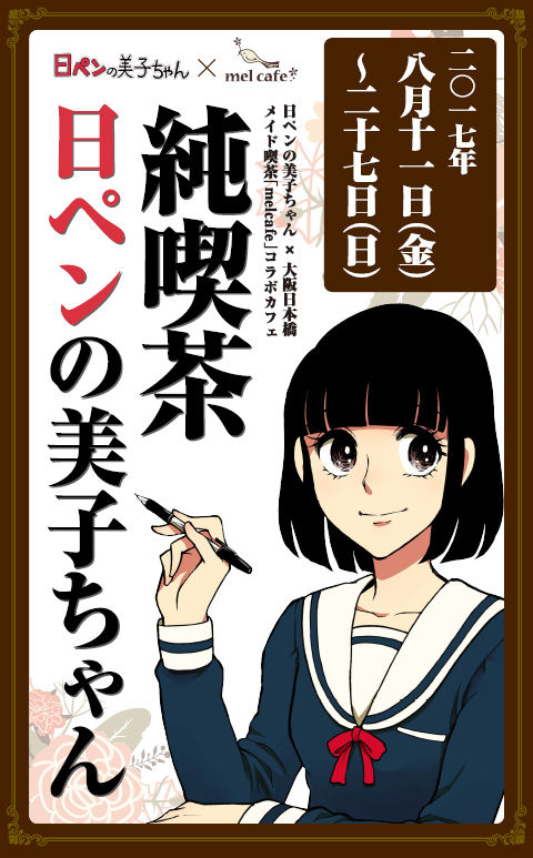 学文社によるボールペン習字講座の広告マンガ「日ペンの美子ちゃん」と大阪のメイド喫茶・melcafeによる期間限定のコラボカフェ「純喫茶日ペンの美子ちゃん」が、8月11日から27日までオープンする。