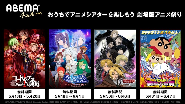 「自宅で過ごす時間が長くなっている状況の中でも、『ABEMA』を通じて少しでも楽しい時間を過ごしていただきたい」との思いから、4月27日より5週間にわたり行われている本企画。5月11日から31日にかけては、第2弾として「コードギアス 反逆のルルーシュ」シリーズや「劇場版 鋼の錬金術師 シャンバラを征く者」「涼宮ハルヒの消失」「この世界の片隅に」「映画クレヨンしんちゃん」シリーズなど30タイトル以上が順次無料配信される。