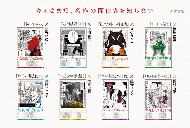 「キミはまだ、名作の面白さを知らない」は、ポプラ社の児童向け文庫レーベル・ポプラポケット文庫より刊行されている名作文学8作品を、マンガ家たちによる描き下ろしの1コママンガをあしらった限定カバーで装い新たに刊行する企画。このたび、浅野いにおが夏目漱石「坊っちゃん」、板垣巴留がロフティング「ドリトル先生」、市川春子が宮沢賢治「銀河鉄道の夜」、衛藤ヒロユキがバウム「オズの魔法使い」、大童澄瞳がベルヌ「十五少年漂流記」、スケラッコが宮沢の「注文の多い料理店」、種村有菜がブライトン「おちゃめなふたご」、星野リリィがスティーブンソン「ジキル博士とハイド氏」のカバーを手がけることが発表され、そのイラストもお披露目された。各作家からはコメントが到着している。