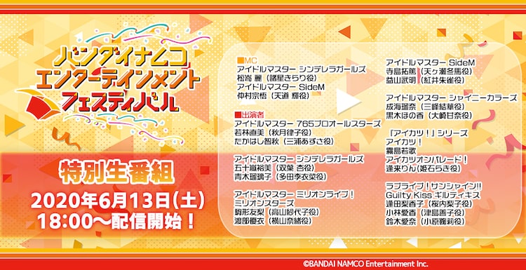 配信はバンダイナムコエンターテインメントの公式サイト・アソビストア、YouTubeチャンネル・876TVにて実施。MCを務める「アイドルマスター シンデレラガールズ」諸星きらり役の松嵜麗、「アイドルマスター SideM」天道輝役の仲村宗悟に加え、若林直美、たかはし智秋、寺島拓篤、逢来りん、逢田梨香子ら15名が登場予定だ。