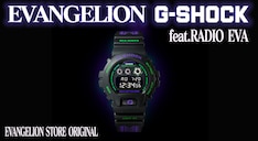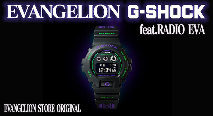 初号機をモチーフにして製作されたこのG-SHOCKは、「エヴァンゲリオン」の公式アパレルブランド・RADIO EVAのデザインによるもの。キーカラーであるパープルとグリーンを基調とし、バンド部分には初号機の目を連ねた抽象的なデザインが施された。本体のベースには3つのインジケーターが特徴の人気モデル「DW-6900」を採用。文字盤を明るくする照明装置のELバックライトはNERVの中央作戦司令をイメージし、点灯させると赤く光る仕様となっている。またパッケージにも初号機をイメージしたオリジナルデザインが用いられた。