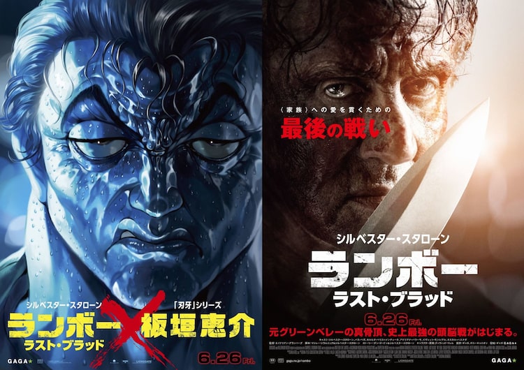 左から板垣恵介による描き下ろしイラストを使用したポスタービジュアル、「ランボー ラスト・ブラッド」本ポスタービジュアル。