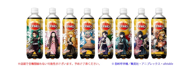 コラボデザインボトルは竈門炭治郎、竈門禰豆子や、鬼殺隊の“柱”である冨岡義勇、胡蝶しのぶらキャラクターが描かれたものなど全8種をラインナップ。600mlペットボトルの通常デザイン商品に代えて、数量限定で展開されている。