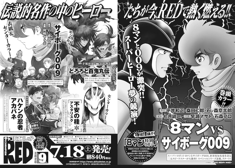 7月18日に発売される月刊チャンピオンRED9月号(秋田書店)より、シリーズ連載「8マンvsサイボーグ009」がスタートすることが、本日6月19日発売の同誌8月号で告知された。