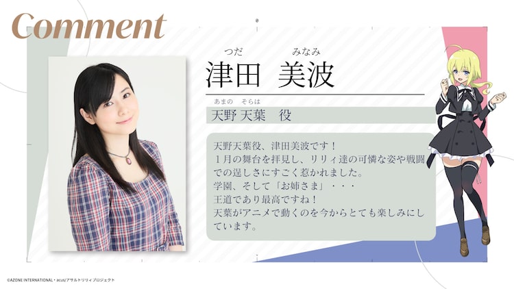 TVアニメ「アサルトリリィ BOUQUET」の追加キャストが4週連続で公開に。第1弾として天野天葉役の津田美波の出演が発表された。