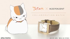 INDEPENDENTは、カジュアルからフォーマルまで幅広いシーンで使える時計ブランド。500本の数量限定となるコラボ腕時計は、「夏目友人帳」をイメージした和風のテイストがデザインに盛り込まれた。四角い文字盤の12時の位置にはニャンコ先生が配置され、四隅には花のモチーフが描かれている。ベルトには高級感ある牛皮革を使用し、時計のケース部分は上品なゴールドで仕上げられた。裏蓋にはシリアルナンバーとINDEPENDENTのブランドロゴ、「夏目友人帳」のタイトルロゴを刻印。専用のボックスにもタイトルロゴがプリントされ、黒のスリーブケースが付属する。