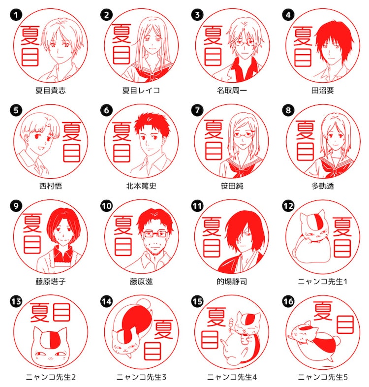 「夏目はんこ帳」には主人公・夏目貴志をはじめ、ポーズ違いで8種を揃えたニャンコ先生や、三篠、柊といった妖怪など31種類をラインナップ。漢字は3文字まで、ひらがな・カタカナは5文字まで、アルファベットは6文字まで、はんこに入れることができる。またフォントは3種類が用意された。