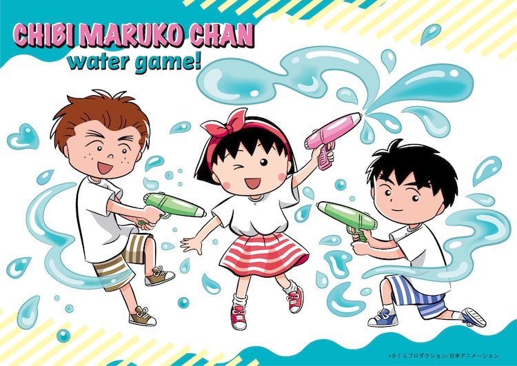 「ちびまる子ちゃん サマーワゴン」では、夏をイメージした描き下ろしアート「ちびまる子ちゃん ウォーターゲーム」がお目見え。まる子、大野くん、杉山くんの3人組がウォーターシューターで遊んでいる姿が描かれ、同ショップではこのイラストを使用したウエットティッシュ缶、アクリルスタンドといった新商品が先行販売される。