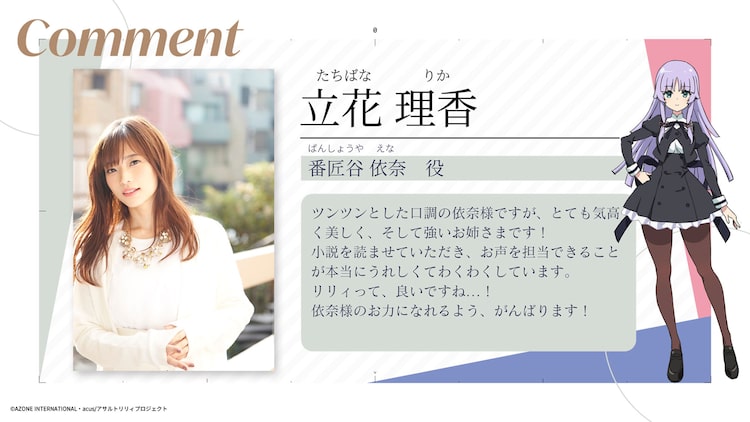 これは4週連続で追加キャラクターとそのキャストを公開する施策の第4弾として発表されたもの。立花は自身が演じる依奈について「ツンツンとした口調の依奈様ですが、とても気高く美しく、そして強いお姉さまです!」と語り、「依奈様のお力になれるよう、がんばります!」と意気込んだ。また「アサルトリリィプロジェクト」公式Twitterアカウント(@assaultlily_pj)では、立花の直筆サイン入り色紙を抽選で1人にプレゼントするキャンペーンを実施。欲しい人は7月19日23時59分までに当アカウントをフォローして、キャンペーンツイートをリツイートしよう。
