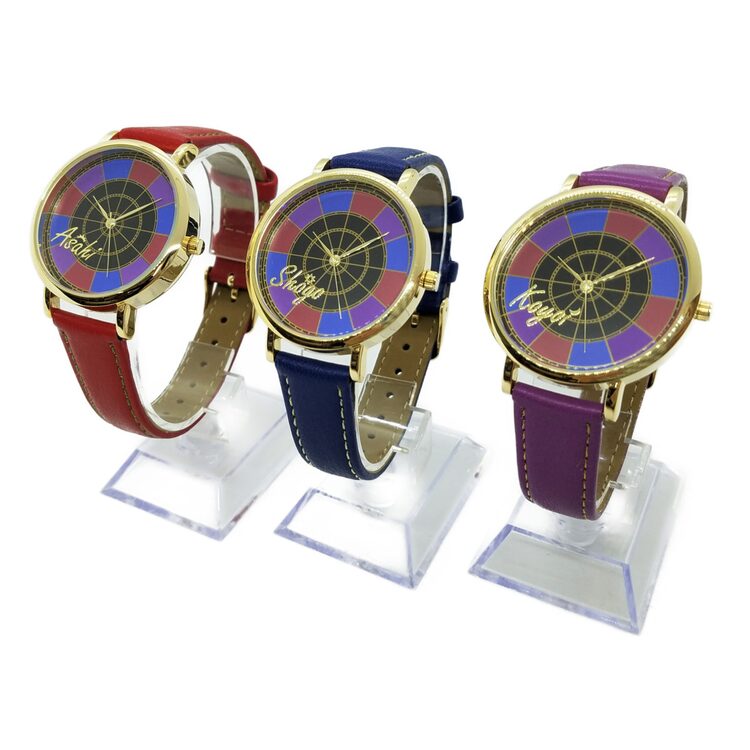 ベルトがブルーのショウゴモデル、レッドのアサヒモデル、パープルのコヨイモデルが揃えられたこの腕時計。ライブステージを思わせる文字盤に各キャラクターの名前が配され、裏面にもそれぞれのサインがデザインされている。価格は税込各3850円。アサミズカンパニーが運営する楽天市場内のショップ・TOY TIMEにて予約でき、購入者には9月下旬頃から順次発送される。