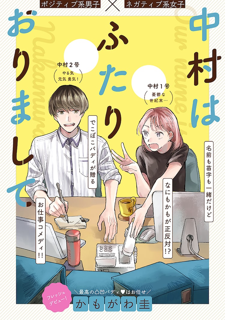 ポジティブとネガティブ、正反対な2人の中村を描くお仕事コメディ 2020年7月16日2020年7月16日 editor 「中村はふたりおりまして」扉ページかもがわ圭の読み切り「中村はふたりおりまして」が、本日7月16日にCOMICポラリスにて公開された。 「中村はふたりおりまして」は、ポジティブ系男子の中村勇気とネガティブ女子の中村憂紀という、2人の“なかむらゆうき”が在籍する会社を舞台に描くお仕事コメディ。憂紀は同期で明るく仕事のできる勇気と自分を比べて焦りを感じていた。そんな中、勇気がとあるミスを引き起こしたことで、憂紀は彼の意外な一面を知ることになる。 関連記事あいち・なごやアニメ映画祭で細田守劇場9作品を一挙上映 トークプログラムに登壇「狼と香辛料」第2期ビジュアル、ロレンス&ホロが船に乗り新たな地へ スタッフも公開「時光代理人 -LINK CLICK- 英都篇」放送は来年2月から、新キャラたちの姿を公開大切な家族を2度と失わないため、絶望から立ち直る「アルドの異世界転生」新連載アニメ「着せ恋」2期公式ファンブックの書影解禁、福田晋一描き下ろしイラストも収録「姫様“拷問”の時間です」第2期 姫と魔王軍が笑顔で食卓を囲むキービジュアル Tweet
