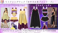 ラインナップされたのは「おやすみ用ブラ&ショーツセット」「ブラカップ付きロングキャミソール」「ルームパンツ」の3アイテムで、それぞれ「劇場版 美少女戦士セーラームーンS かぐや姫の恋人」に登場する人間の姿になったルナと、「美少女戦士セーラームーンR」に登場するブラック・レディをデザイン。「ルナ(かぐや姫の恋人Ver.)モデル」は、淡いイエローの生地にパープルのフリルや花をイメージしたデザインが施され、「ブラック・レディモデル」は、黒の生地にラメの入ったピンクを組み合わせで、ブラック・レディのピアスや額のマークをイメージした刺繍が施された。