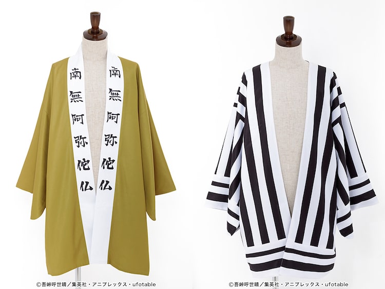 悲鳴嶼の羽織は前立てと背面に「南無阿弥陀仏」の文字が描かれ、インパクトのある仕上がりに。伊黒の羽織は印象的な縦縞が全面プリントされ、袖口の横縞も忠実に再現された。