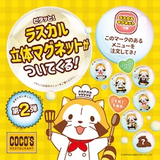 今回の施策は、2019年10月に実施されたキャンペーンに続く第2弾。前回の好評を受け、今回も「ラスカルマグネットつき」と記載のある対象商品を注文するごとに、新たなデザインの「ピタッと!ラスカル 立体マグネット」がプレゼントされる。マグネットはココスのユニフォームを着て掃除をするラスカルや、注文にあわてるラスカル、ココスで提供されている包み焼きハンバーグを運ぶラスカルなど全6種類が用意された。なおキャンペーンはノベルティがなくなり次第終了となるのでご注意を。