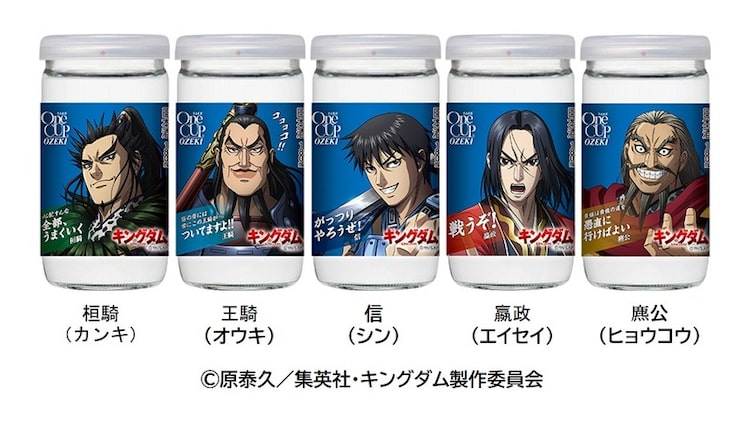 1964年10月10日に誕生し、大関を代表する商品の1つとなった「ワンカップ」。「ワンカップ」55周年の締めくくりとして登場する「上撰ワンカップ キングダム 180ml瓶詰」は、信、えい政、王騎、ひょう公、桓騎の描き下ろしイラストをラベルにデザインした全5種が展開される。また裏ラベルには、それぞれのキャラクターのプロフィールが掲載された。