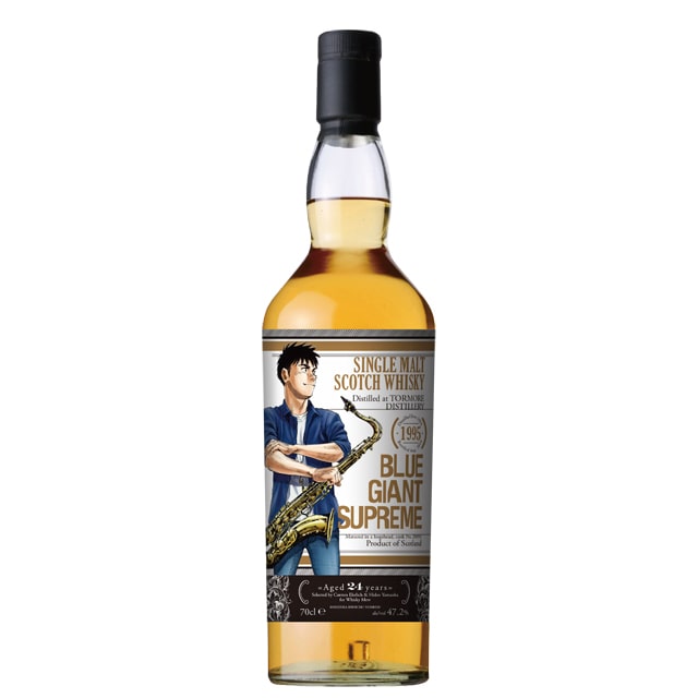 ウイスキーコレクターであり評論家の山岡秀雄が「BLUE GIANT SUPREME」のラベルに合わせたウイスキーは、スコッチの聖地・スペイサイド地域のトーモア。ジャズの全盛期である1950年代に創業された蒸溜所によるものだ。ウイスキーの価格は税込2万3100円。218本限定の発売となる。
