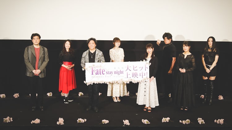 劇場版「『Fate/stay night [Heaven’s Feel]』III.spring song」の「大ヒット御礼舞台挨拶特別興行ライブビューイング」が本日8月22日に催され、須藤友徳監督、衛宮士郎役の杉山紀彰、間桐桜役の下屋則子、セイバーオルタ役の川澄綾子、遠坂凛役の植田佳奈、イリヤスフィール・ フォン・アインツベルン役の門脇舞以、言峰綺礼役の中田譲治、ライダー役の浅川悠が登壇した。