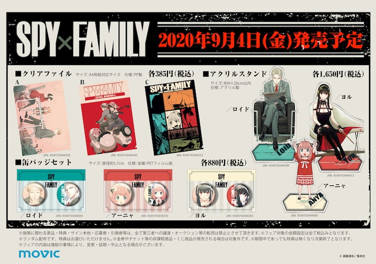 今回のグッズには、クリアファイル、缶バッジが登場。各アイテムには仮初めの家族となったスパイのロイド、超能力を持つ少女・アーニャ、殺し屋の女・ヨルがデザインされており、ロイドとヨルのアクリルスタンドにはそれぞれ単行本1巻、3巻のカバーイラストが使用された。なおムービックの通信販売では商品の予約を受付中だ。