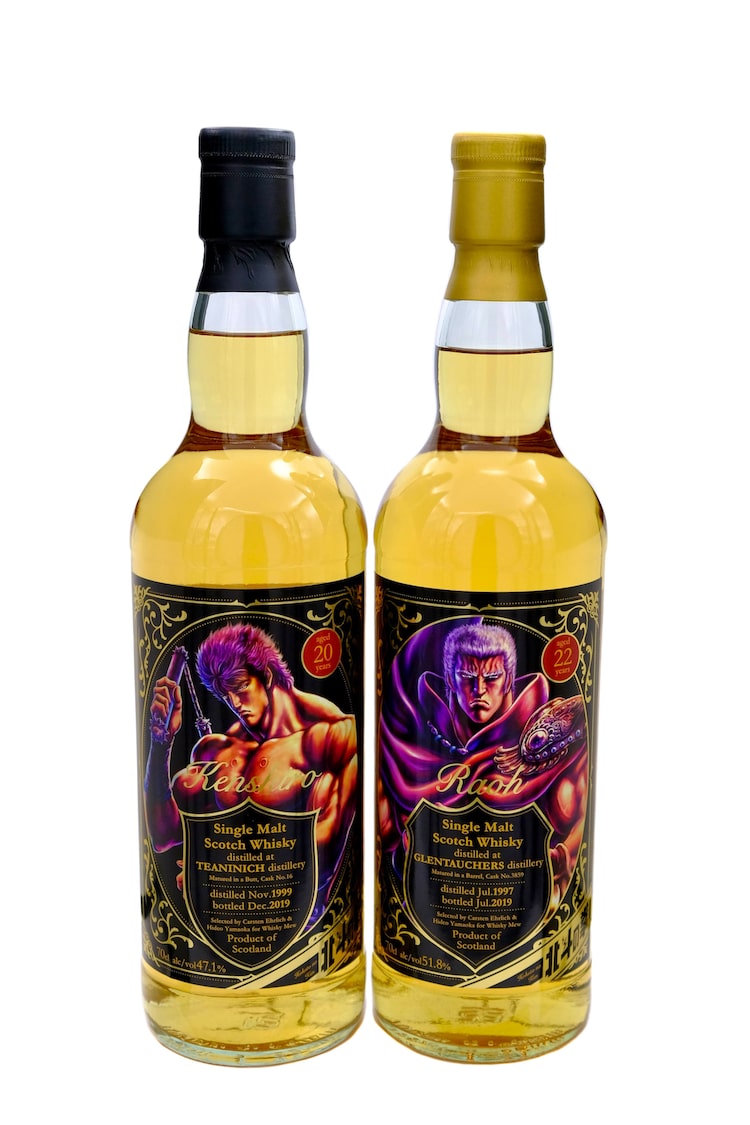 「北斗の拳」ラベルを冠するウイスキーは、ウイスキーコレクターの山岡秀雄氏がセレクト。ケンシロウラベルはスコットランド・ハイランド地方産の「ティーニニック1999」に、ラオウラベルは同じくスコットランド・スペイサイド産の「グレントファース1997」に貼られている。価格は「ティーニニック1999」が税込2万900円、「グレントファース1997」が税込2万4200円だ。