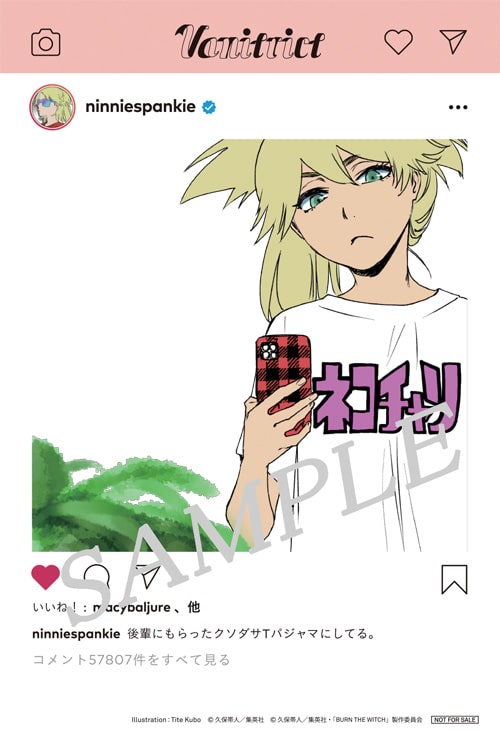 来場者特典は「『BURN THE WITCH』SNS風クリアカード」。1週目にはニニー、2週目にはのえるのクリアカードが用意された。いずれもイラストは久保による描き下ろし。来場者特典は数量限定のため、なくなり次第配布終了となる。