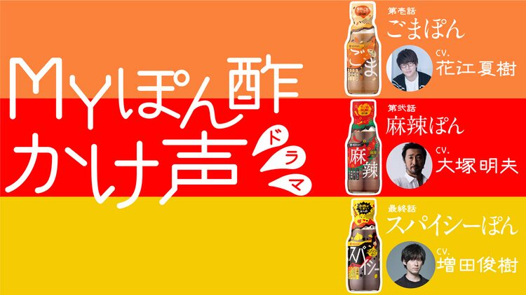 「MYぽん酢 “かけ声” ドラマ」は、ぽん酢をかける映像に声優陣が声をかける“かけ声”を中心に展開されるもの。花江は「第壱話『ごまぽん~君のちょいかけをみていたい~篇』」、大塚は「第弐話『麻辣ぽん~ピリ辛が好きなとこ俺以外に見せるなよ~篇』」、増田は「最終話『スパイシーぽん~相性抜群すね!肉と~篇』」にそれぞれ出演し、「君は知ってる?そのMYぽん酢に、ごまが何粒入っているか」「俺、知らなかったよ。お前、辛いのいけんだな」「先輩!ふふ、つまみ食いしましたよね?」とぽん酢をかける映像に“かけ声”を加え、恋愛ドラマを展開していく。