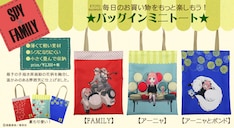 バッグインミニトートは横25cm、縦30cmの小さめサイズ。ロイド、ヨル、アーニャの3人をデザインした「FAMILY」、椅子に腰掛けたアーニャを描いた「アーニャ」、アーニャとボンドがお昼寝する様子をプリントした「アーニャとボンド」の3種類が用意されている。価格は税込各2530円。