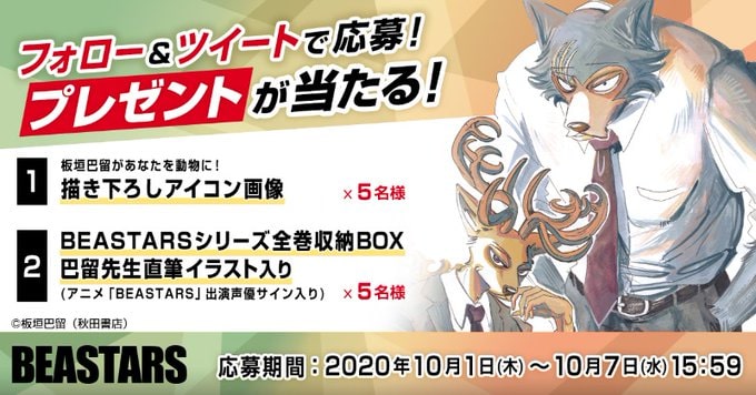 作品の公式アカウント(@Beastars_WC)では、本日10月1日からプレゼントキャンペーンを行う。賞品は板垣が応募者を動物にして描き下ろした画像と、「BEASTARS」の単行本全巻が収納できるボックスの2種類。ボックスには板垣直筆のイラストと、アニメ「BEASTARS」出演声優のサインが入れられる。当選するのはいずれも5名ずつ。応募条件は公式アカウントをフォローすることと、応募用ツイートにある選択肢から欲しい賞品を選んでツイートすることの2つで、応募期間は10月7日の15時59分まで。当選者10名には、ダイレクトメッセージにて通知が送られる。詳細はマンガクロスの「BEASTARS」ページで確認を。