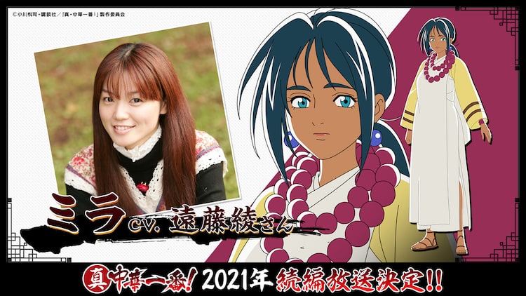 「中華一番!」シリーズは19世紀の中国を舞台に、天才料理人リュウ・マオシンの活躍を描く料理マンガ。2019年に放送されたアニメ「真・中華一番!」の続編となる今作は2021年にオンエア予定で、裏料理界の最高幹部である“五虎星”が登場することが発表されていた。遠藤が演じるミラは「鏡のミラ」の異名を持つ“五虎星”の紅一点。香辛料王国インドの血が流れている美女で、その澄みきった青眼で目にした料理方法を瞬間的にコピーする能力を持つ。なお“五虎星”のキャストは今週から5週連続で発表されていく予定だ。
