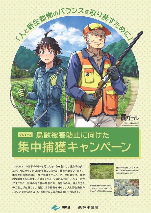 緑山のぶひろ「罠ガール」が農林水産省、環境省による「鳥獣被害防止に向けた 集中捕獲キャンペーン」とコラボ。描き下ろしイラストを使用したポスターが制作された。