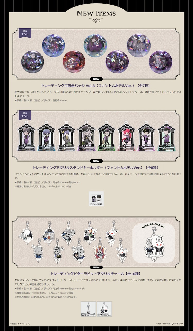 単体ではもちろん、連結して使ってもかわいい「トレーディングビターラビットアクリルチャーム」は、10個セットでの販売も。セットには特典として限定絵柄のチャーム1種が付属する。お土産気分も味わえそうな「ファントムホテルクッキー」は、クッキーの入った箱の底板が取り外せる仕様。底板には本ポップアップストアのキービジュアルがあしらわれており、カードとして飾っても楽しめる。