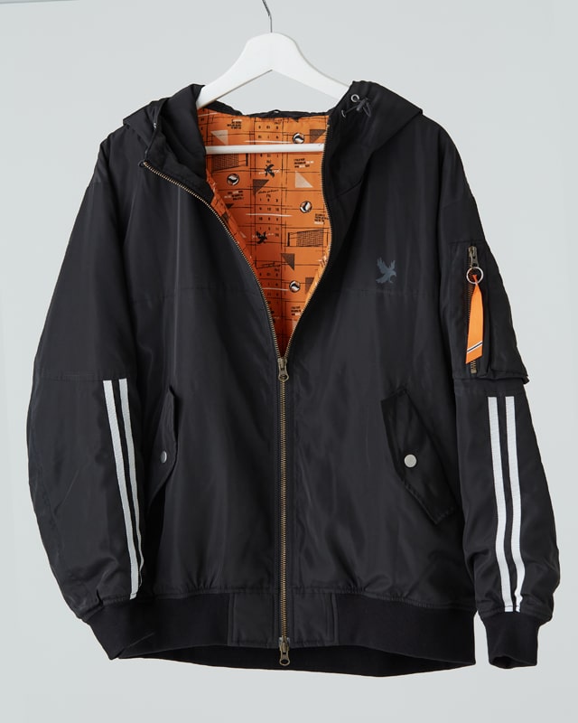 烏野高校をイメージしたMA-1は、胸元にカラスのマークをさり気なくプリント。腕部分のファスナーにはオレンジの引手を用い、ジャケットの内側にはカラスやバレーボール、背番号をポップにあしらったオリジナルの生地が採用された。一方のショルダーバッグは烏野高校、音駒高校、青葉城西高校、梟谷学園高校、稲荷崎高校の5種類をラインナップ。ブラックを基調とし、ショルダーパットとファスナーの引手部分には各高校のイメージカラーが差し込まれた。また内側には各高校のイメージカラーを用いたオリジナルのプリント生地が使用されている。