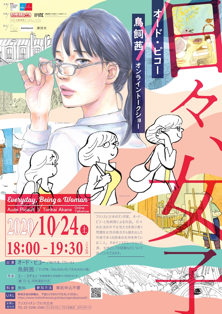 これはアンスティチュ・フランセ日本とアリアンス・フランセーズ日本が主催する、日仏の文学とマンガ、バンドデシネにまつわるイベント「読書の秋 2020」の一環として行われるもの。30代の女性の日常を描いた「クレール パリの女の子が探す『幸せ』な『普通』の日々」などを執筆するオード・ピコーと、「おんなのいえ」「地獄のガールフレンド」などで知られる鳥飼が、互いの作品やインスピレーションの源、女性としての経験といった幅広いテーマで語り合う。トークショーはYouTubeで無料配信されるほか、会場となるアンスティチュ・フランセ東京でも無料で聴講できる。入場は40人限定で、アンスティチュ・フランセ東京の公式サイトより事前申込が必要だ。