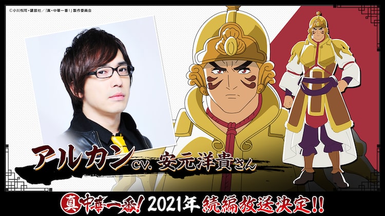 5週連続で発表されている“五虎星”のキャスト。第4弾として公開された安元演じるアルカンは別名・爆炎厨師と呼ばれ、武人のように潔く気骨ある性格の持ち主だ。中華料理の根本ともいえる炎を自在に操る力を持ち、常人の数倍といわれる体温を封じこめるため、常に大量の冷却水を携えている。なおほかの“五虎星”のキャストとして、ミラ役に遠藤綾、ジュチ役に小野大輔、エンセイ役に津田健次郎が名を連ねた。アニメ「真・中華一番!」の続編は2021年にオンエアされる。