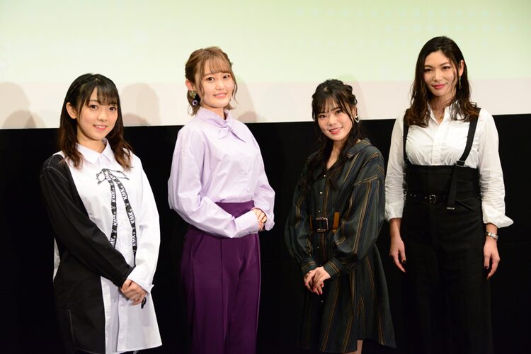 この会場で初めて明らかになったのが、エンディングテーマが1995年のヒット曲「WOW WAR TONIGHT ~時には起こせよムーヴメント~」のカバーであるということ。同曲は浜田雅功と小室哲哉のコラボにより誕生したユニット・H Jungle with tの楽曲で、今回のカバーでは水樹奈々演じる天野愛莉と、Raychell演じる姫神紗乃の2人が歌唱する。Raychellは「子供の頃聴いていた楽曲なので、まさかカバーさせていただけるとは思っていなかったですし、水樹奈々さんと一緒に歌わせていただけたことが本当にうれしいです」と喜びを語り、キャスト陣も「カッコよかった!」と絶賛した。