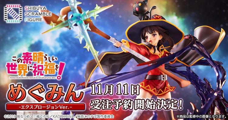 フィギュアブランド・SHIBUYA SCRAMBLE FIGUREの新商品として登場したこのアイテム。爆裂魔法を放つ瞬間のめぐみんが1/7スケールでフィギュア化された。マントがはためき、髪の毛が風になびく様子が丁寧に造形されている。価格は税込3万2780円。予約受付は11月11日に開始予定で、予約方法はeStreamの公式SNSにて後日発表される。