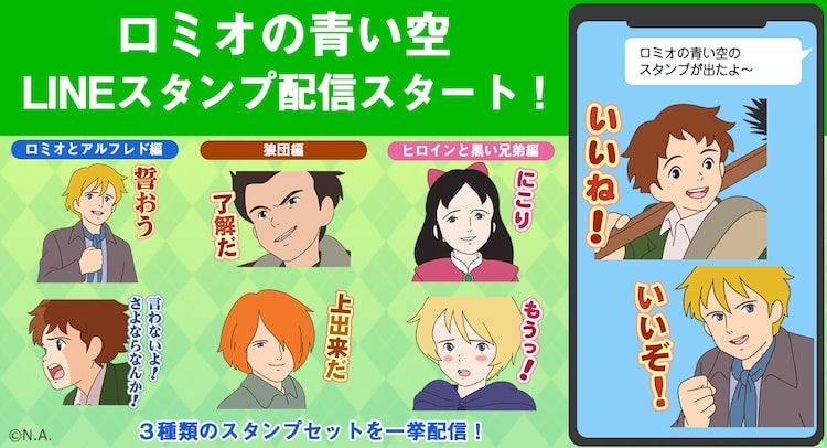 アニメ本編の名シーンをイメージした「ロミオの青い空」LINEスタンプ。「ロミオとアルフレド編」「狼団編」「ヒロインと黒い兄弟編」の3セットが用意され、それぞれ40点の絵柄が収められた。当初販売は1セットのみを予定していたものの、スタッフが作品を愛するあまりスタンプに使用するシチュエーションを絞りきることができず、3セットの一挙配信に至ったという。購入にはそれぞれ税込120円または50コインが必要だ。